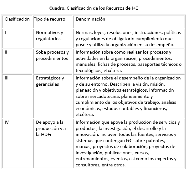 2. Clasificar o categorizar los recursos de I+C. Para organizar el conjunto de recursos que pueden detectarse los cuales pueden variar y aumentar en dependencia del tipo de organización y de sus características, en la tabla 1 se propone una clasificación general, atendiendo al propósito para el cual están concebidos, partiendo de la clasificación de tipo de documentación de Artiles Visbal, 28 adaptándola a los propósitos de la presente investigación. De esta manera se propone una categorización de recursos de I+C en cuatro tipos fundamentales: I) Normativos o regulatorios, II) Sobre procesos y procedimientos, III) Estratégicos y gerenciales y IV) De apoyo a la producción y a la I+D+i (cuadro).