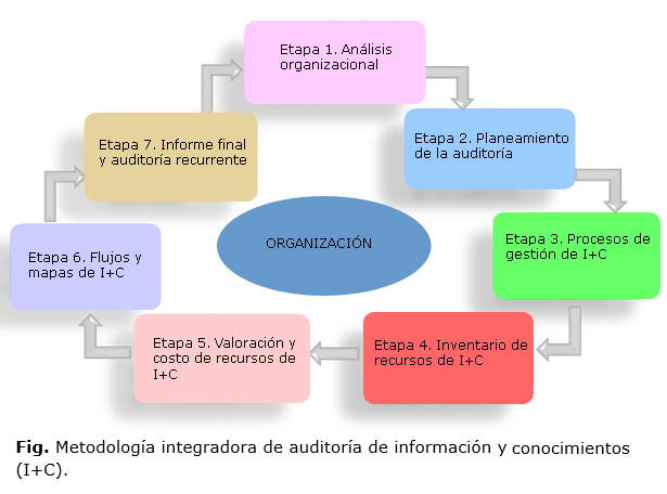 Este trabajo presenta una metodología integradora de la auditoría de la información y el conocimiento (I+C) para organizaciones, conformada por siete etapas con un enfoque híbrido, dirigida a revisar la estrategia y la política de gestión de I+C, identificar, inventariar y mapear dichos recursos y sus flujos, así como valorar los procesos asociados a su gestión. Integra el diagnóstico y la evaluación de la gestión de I+C de manera conjunta; permite su planificación y su ejecución con un menor gasto de recursos y trae beneficios adicionales al equipo de auditores y su preparación previa a la ejecución de la auditoría, al disponer de una metodología y de un instrumento único y flexible, el cual puede adecuarse a las características específicas de cualquier organización.