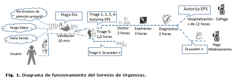 Una vez que el paciente pasa por el triaje inicial, debe autorizar el servicio por su EPS, lo cual puede tardar entre 20 y 30 min. Una vez autorizado, espera su turno para ser atendido por el médico, lo que puede suponer de 30 min a 2 o 3 horas dependiendo del tipo de triaje que le hayan asignado y de la congestión que presente el servicio. Si el médico solicita exámenes, debe esperar de 1 a 2 horas para que los tomen y de 3 a 5 horas para que los resultados lleguen al médico que los solicitó. Una vez que llegan los resultados, puede tardar alrededor de una hora para que lo llamen nuevamente. Si los resultados apoyan un diagnóstico, el médico puede enviar al paciente a su casa con tratamiento o puede solicitar la hospitalización si lo requiere. Si el médico necesita una interconsulta con un especialista puede, dependiendo del caso, dejar en observación al paciente hasta que sea valorado por el especialista, o solicitar la valoración como un servicio no urgente.