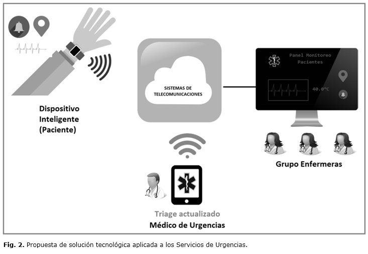 Con el fin de minimizar los problemas observados en el caso de estudio, se propone una solución tecnológica, basada en el concepto de Internet de las Cosas (IoT, por sus siglas en inglés), aplicada a los servicios de urgencias. El IoT es un nuevo paradigma tecnológico que consiste en un sistema de sistemas de miles de millones de cosas, objetos inteligentes (físicos y virtuales), altamente conectados e identificados de manera única en Internet, con capacidades de medición, procesamiento y comunicación. Estos objetos son capaces de interactuar entre sí y de cooperar entre ellos para alcanzar objetivos comunes.15 Se habla también del "Internet de uno". IoT tiene un gran potencial para optimizar los procesos y operaciones en el sector salud, específicamente en los servicios de urgencias.