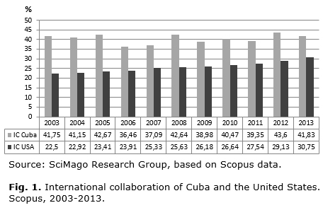 If we analyze the association strategies in terms of Science and Technology, and taking into account the scientific output covered by Scopus, Cuba and the United States show similar patterns. Both countries have a low percentage of international collaboration (Fig. 1). The range of Cuban international cooperation oscillates above 40 % during the period 2003-2013, and that of the United States grew from 22.5 % in 2003 to 30.8 % in 2013. This could be due to their strong national science systems, which are characterized by relative independence from international links.