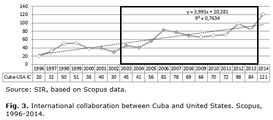 Scopus, developed by Elsevier, was used as information source. SCImago Institutions Rankings (SIR), a Scopus-based tool developed by the SCImago Research Group (Spain),11 was used to retrieve data on the international collaboration between Cuba and United States during the period 2003-2013. Characterization of papers published in association by scientists from Cuban and American institutions was performed through a set of bibliometric indicators included in the SIR Methodology: