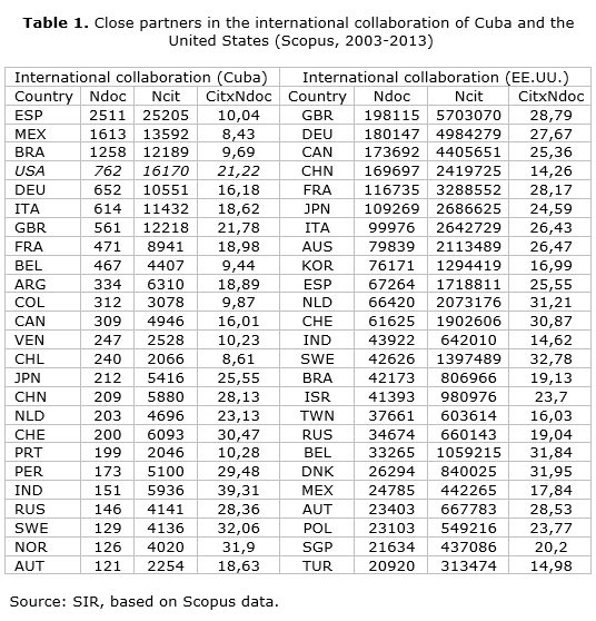 Diferencias políticas entre los gobiernos de Cuba y los Estados Unidos después del año 1959 han dejado un rastro profundo en múltiples generaciones en ambos países, incluyendo a los científicos. De hecho, la carencia de puentes científicos entre Cuba y los Estados Unidos es una declaración ampliamente asimilada por la opinión pública. El embargo del gobierno de los EE.UU. afectó todas las esferas de la vida cubana, y la ciencia no fue una excepción. Aun así, las interacciones científicas nunca han sido un punto muerto. El objetivo principal de esta comunicación breve es revelar las características de estas relaciones científicas, y confirmar el aumento de enlaces entre ambas comunidades científicas desde una perspectiva bibliométrica. Scopus fue utilizado como fuente de datos. SCImago Institutions Rankings, una herramienta basada en Scopus, fue utilizada para analizar el liderazgo y los patrones de colaboración. Ambos países exhibieron semejanzas en estrategias de asociación para actividades de investigación y desarrollo, y revelaron una independencia relativa de enlaces internacionales. Sin embargo, Estados Unidos fue el cuarto socio científico de las instituciones cubanas, y la colaboración internacional entre científicos cubanos y americanos aumentó durante todo el período estudiado. Se identificaron redes de investigación bien establecidas. Es de esperar que en el nuevo contexto político se fortalezcan las alianzas investigativas.
