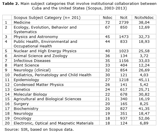 The United States was the fourth scientific partner of Cuban institutions during the period 2003-2013, producing 762 articles and receiving more than 20 citations per article in Scopus database (table 1). Despite a clear Latin American orientation in Cuban international collaboration, 17 countries match in the rank of 25 main scientific partners of both countries. In general, the impact of the United States output is higher, which is determined by different factors: language of publication, visibility of journals, and topics dealt with in papers. This is visible in the collaboration links. Nevertheless, there are some exceptions, such as Cuba's collaboration with Japan, China, India, Russia, Sweden or Switzerland, which has a similar or even greater impact than collaboration between the United States and these countries.