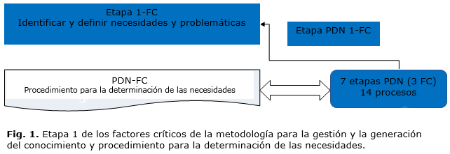Etapa 1. Identificar y definir las necesidades y la problemática. La identificación de las necesidades de la generación de un nuevo conocimiento sirve de base a todos los procesos que intervienen en la generación del conocimiento, así como en su socialización. Es la base fundamental para que los restantes procesos permitan obtener el impacto deseado, por lo que se considera uno de los FC más importantes de la metodología.