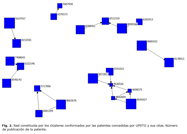 A partir de los resultados obtenidos en las diferentes etapas, y en especial en la etapa 5 de los FC, se establece una nueva estrategia de búsqueda (EB-2) y se retorna a la etapa 2. Lo anterior permitió recuperar información que no se obtuvo al aplicar la EBP-1. Por otro lado, la estrategia EB-2 permitió la identificación de la necesidad de utilizar otras herramientas para el procesamiento de la información contenida en las patentes concedidas y sus citas anteriores y posteriores; esto permitió su visualización en redes y clúster.33 Del procesamiento y el análisis de las informaciones recobradas mediante las EBP-1 y la EB-2 se generó un nuevo conocimiento, que permitió dar respuesta al objeto y objetivo definidos en la Etapa 1 de los FC y por tanto a las necesidades o problemáticas del usuario.