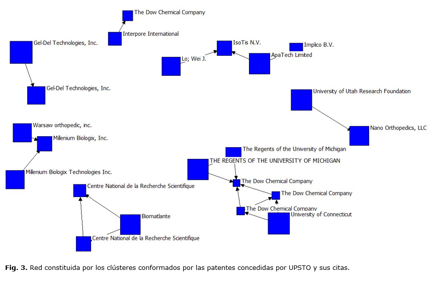 Se observa en la figura 2 la red conformada por los clústeres integrados por patentes concedidas que se citan entre sí, lo que permitió identificar de forma visual cuáles son las patentes que tienen algún tipo de relación entre ellas, lo que facilita el análisis y la interpretación de la información. La figura 3 muestra los clústers de los titulares de las patentes. Por ejemplo, se observa un clúster conformado por tres patentes cuya titularidad pertenece a la Dow Chemical Company, y tres de titularidad de dos universidades. La información obtenida a partir del procesamiento de los datos de las patentes concedidas recobradas por las estrategias de búsquedas trazadas a partir de la metodología MGGC fueron procesados y se obtuvieron los resultados que se muestran (Fig. 4 y 5). Los resultados obtenidos demuestran que existe una tendencia positiva en la actividad inventiva relacionada con el campo de los biomateriales de hidroxiapatita.