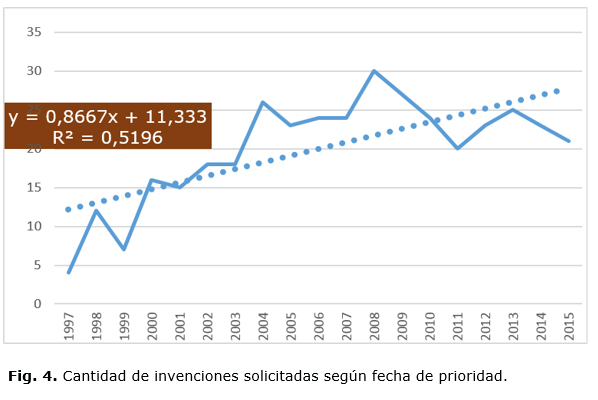 Al analizar las invenciones recobradas a partir del procesamiento de las patentes obtenidas de la base de datos de PatentScope (Fig. 4), se puede apreciar que existe una actividad inventiva sostenida a partir del año 2004, y se destaca el año 2008, en el que se presentaron 30 solicitudes de invención, lo que coincide con el aumento de solicitud de invenciones correspondientes a China, a partir del año 2007.
