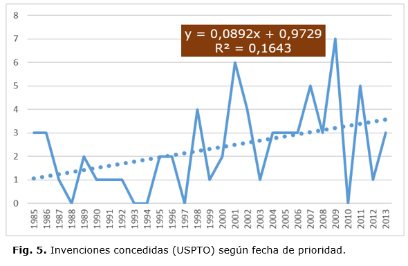 Si se analiza la actividad inventiva relacionada con las invenciones concedidas por USPTO, tomando en cuenta la fecha de prioridad, se observa (Fig. 5) que, aunque se mantiene una tendencia positiva, esta es menor que la que se obtiene al analizar el total de invenciones solicitadas a nivel mundial. En este caso, solamente se tuvieron en consideración las invenciones que han sido concedidas y no el total de solicitadas, lo que conlleva que exista una disminución en la tendencia, que se acerca más a la actividad inventiva real. Es importante señalar que un gran número de patentes solicitadas no se conceden, lo que responde a diversos factores, entre los que se destacan la falta de novedad y la falta de actividad inventiva.
