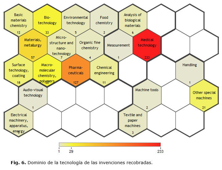 Se observa en la figura 6 que los campos de dominio de la tecnología que se muestra en la base de datos para la estrategia de búsqueda trazada son aquellos relacionados con las tecnologías médicas (233 invenciones) y con invenciones relacionadas con los medicamentos (127). El análisis de estos datos, redes y el contenido de los documentos de patentes y no patentes, permitió a los analistas generar un nuevo conocimiento a partir del cual se emitieron conclusiones y recomendaciones que sirvieron de base para identificar:
