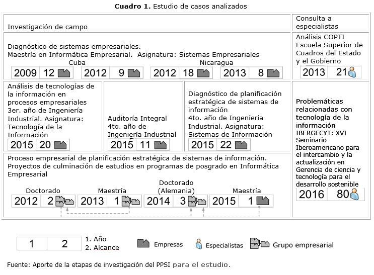 En este contexto, se realizan los estudios de casos mostrados en el cuadro 1, en los que se detectan, fundamentalmente mediante observación, el análisis causa-efecto y las entrevistas a especialistas y asesores empresariales de los proyectos docente-investigativos, problemáticas en diferentes organizaciones relacionadas con la gestión y la explotación de TI y SI que demuestran la necesidad de una visión integrada en la organización, y la influencia negativa que ejerce la segmentación del conocimiento. Todos los hallazgos realizados en la investigación de campo se complementan con el análisis de la literatura especializada. De igual forma, se evidencia la necesidad de un proceso empresarial de PPSI,8 o al menos del plan estratégico de sistemas de información (PESI), que debe ser resultado de ese proceso, y de una mejor fundamentación de los conceptos asociados a su diseño y aplicación en el entorno empresarial cubano.9