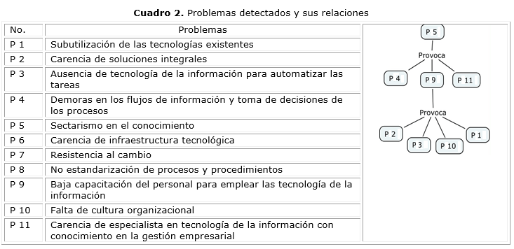 Entre los problemas del 1 al 5 y del 9 al 11, que se han resaltado en color azul en el cuadro 2, se han detectado interrelaciones representadas a modo de árbol de consecuencias. Estas relaciones son obtenidas a partir de las caracterizaciones de las empresas y del uso de tecnologías de la información durante los proyectos investigativos. Como parte de la observación realizada por los investigadores, y de la consulta a los especialistas y asesores de las empresas en que se realizaron los diagnósticos, se identificó que el problema No. 5, sectarismo en el conocimiento, se encuentra generalmente entre las causas de los problemas 4, 9 y 11 de manera directa, y de manera transitiva sobre los problemas 1, 2, 3 y 10, que se originan asociados al problema 9.