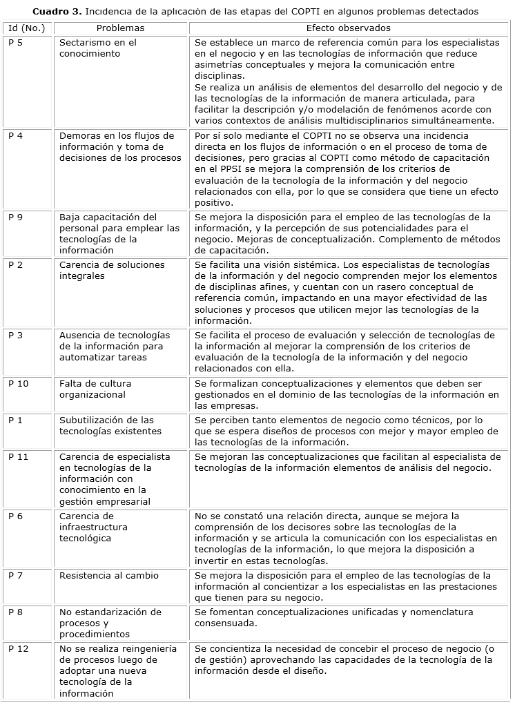 Es por eso que en este trabajo se analiza cómo el empleo del COPTI ha influido en la solución de problemáticas o brechas asociadas al empleo de las TI. Además, se comentan experiencias en el empleo de las etapas del COPTI como método de capacitación asociado al Proceso de Planificación de Sistemas de Información (PPSI),8 especialmente en el plan efectuado en un grupo empresarial farmacéutico, ahora integrado en el grupo Biocubafarma, en el período 2010-2012. Estas problemáticas fueron encontradas en organizaciones cubanas, mediante el desarrollo de cerca de 100 proyectos docente-investigativos, durante el análisis de la dialéctica negocio-TI necesaria para establecer las relaciones de coordinación dentro y entre organizaciones que llevó a la concepción del COPTI.1 También contribuyeron a consolidar la definición del COPTI y al análisis de las brechas en una investigación de doctorado a la que aportaron dos tesis de maestría desarrolladas en dos grupos empresariales diferentes, cuyos resultados fueron consultados mediante encuestas con 101 especialistas en gestión empresarial y en tecnologías de la información.