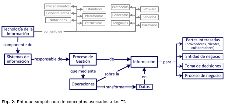 En los proyectos docente-educativos, explicar las interrelaciones entre las múltiples dimensiones de análisis del COPTI ha tenido un impacto positivo para esclarecer que las TI son un conjunto evolucionario de elementos, algunos de ellos presentes en la figura 2, empleados en un campo o dominio, dígase en un sector industrial o en un proceso de negocios, 15 que además tiene perspectivas organizativas e ideológico-culturales que la convierten en una práctica social, 16 y que se emplean como combinaciones, dadas las diferentes funcionalidades que han desarrollado para satisfacer necesidades de desempeño empresarial, colaboración y gestión. Esto responde a que todo componente en la empresa (proceso, evento, actividad, tarea o función) requiere registrar un flujo de información como evidencia para la gestión. La gestión está compuesta por un ciclo de actividades en las que se encuentra la planificación, organización, dirección y control,17 donde al analizar las definiciones del proceso administrativo se puede concluir que cualquier actividad dedicada a planificar, organizar, dirigir y/o controlar se ocupa fundamentalmente del procesamiento de información proveniente de las actividades dedicadas a la acción, las que, a su vez, requieren información de las otras cuatro para su definición, desarrollo y retroalimentación.