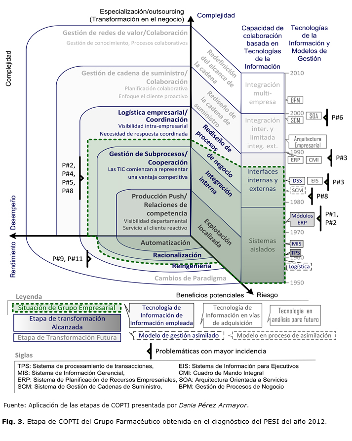 Desde el año 2009 una de las preocupaciones de grupo de investigadores involucrados en la planificación de sistemas de información y en diagnósticos empresariales era la necesidad de homogeneizar raceros de conocimiento, o más bien de reducir brechas como las ejemplificadas anteriormente mediante el concepto de Tecnología de la Información y crear bases sólidas para la comunicación de especialistas de diferentes disciplinas, aun cuando no se midieran dichas asimetrías semánticas dada la falta de percepción de esta necesidad en la organización. La excesiva delegación de responsabilidades en TI a los especialistas de departamentos de informática por la alta dirección de las organizaciones, o por departamentos de negocio y gestión empresarial, es un ejemplo frecuente de esta situación que deviene en decisiones poco efectivas y desempeños mediocres.9 La detección de las problemáticas asociadas a las TI que se realiza desde el año 2009 da una medida de estas brechas y ha permitido que el desarrollo del COPTI sea consciente de ellas para facilitar un rasero multidisciplinar, al habilitar la explicación de cada uno de los elementos analizados como una referencia conceptual que considera enfoques congruentes.