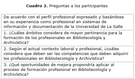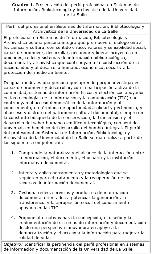 The objective of the present study is to evaluate the professional profile in Information Systems, Library Science and Archival Science declared in the curricular design of the corresponding program at the University of La Salle in Bogotá, Colombia. The study is based on theoretical criteria according to which evaluation of professional profiles is a strategic component in the identification of curricular relevance, on the basis of which adjustments and changes must be proposed aimed at aligning the training offers to the needs imposed by trends in the fields of knowledge and the demands of the labor markets where graduates have accumulated valuable information serving as feedback for those profiles. The qualitative approach and the focal group technique were the essential elements in the methodology. Ten graduates from the Program participated, all of whom held managerial and coordination posts when the study was performed. According to the main results obtained, the following aspects are all highly relevant to the training: project management, budget management, innovation, quality management, knowledge management, planning of projects related to technologies applied to document management, digital management of contents, and preventive conservation of the document heritage in physical and digital formats. It is concluded that professional profile evaluation should be a permanent task which takes account of the constant changes that occur, so as to synchronize the curricular offers of training institutions to the demands of socio-productive sectors and the advancement of science and technology.