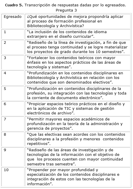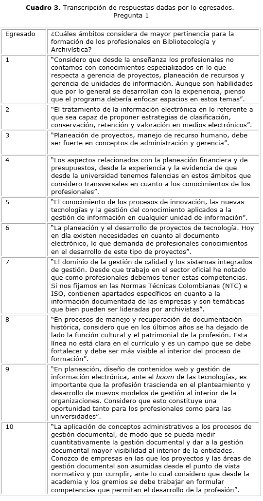 Con respecto a la primera pregunta, relacionada con los ámbitos de mayor pertinencia en la formación de profesionales de Sistemas de Información, Bibliotecología y Archivística, las respuestas de los egresados coincidieron en la necesidad de destacar como campos de mayor pertinencia la gerencia de proyectos, lo cual implica planeación de todo tipo de recursos. Igualmente, el énfasis que se le debe dar desde los planes de estudios al tratamiento y análisis de información electrónica. También se refirieron a aspectos relativos a la gestión de la calidad y a la gestión de procesos de innovación y creatividad, que asumen a la gestión del conocimiento como un elemento transversal (cuadro 3).