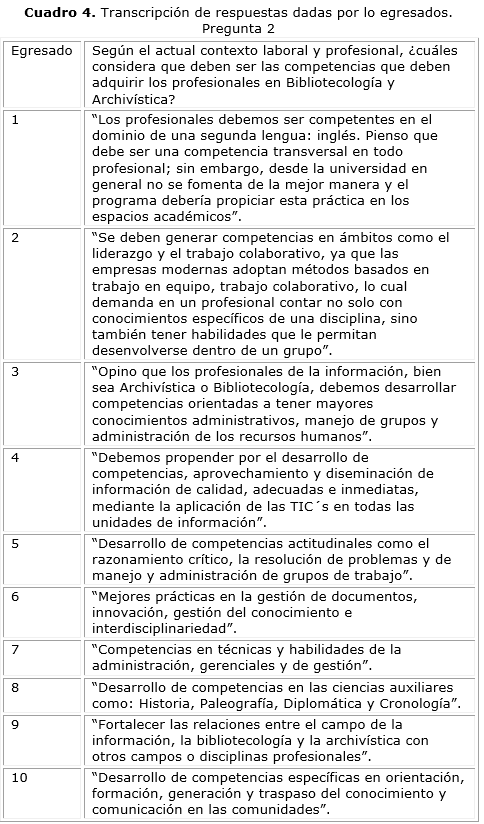 En cuanto a la segunda pregunta, relacionada con la situación actual del contexto laboral, para cuya interacción efectiva se requiere el dominio de competencias, los egresados señalaron que los profesionales deben mostrar conocimientos, habilidades, destrezas y actitudes hacia la lengua extranjera, así como también competencias denominadas también como transversales. Tal es el caso de: liderazgo, trabajo colaborativo, gestión del talento humano, comunicación, entre otras. En cuanto a las competencias específicas, se resaltan dominios que tienen que ver con el manejo de la paleografía, la apropiación crítica de las tecnologías de información como mediadoras de la gestión de unidades de información, entre otras (cuadro 4).