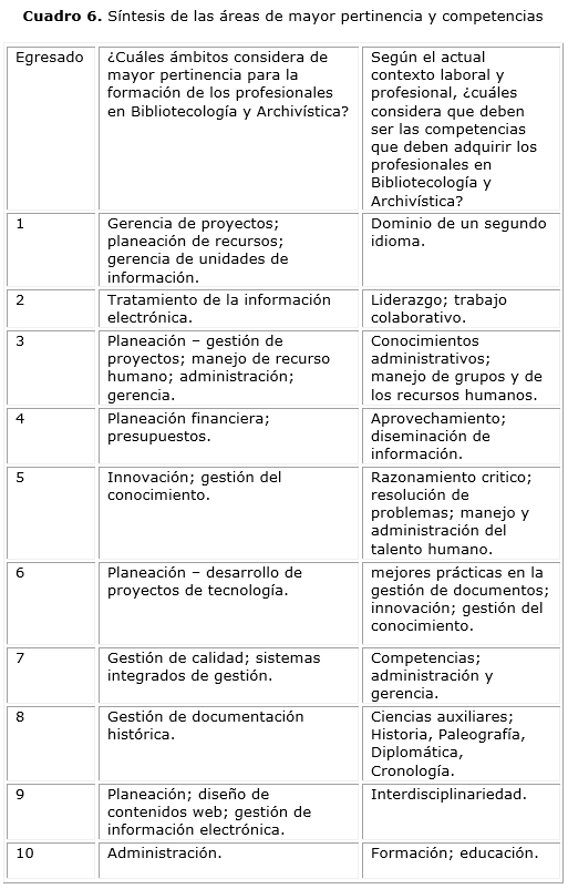 Para sintetizar las concepciones de los egresados en relación con las áreas de mayor pertinencia, en función de las demandas del entorno, se realizó un resumen de las respuestas para derivar los elementos sustantivos presentes en los contenidos lexicales. El cuadro 6 presenta dicha síntesis.
