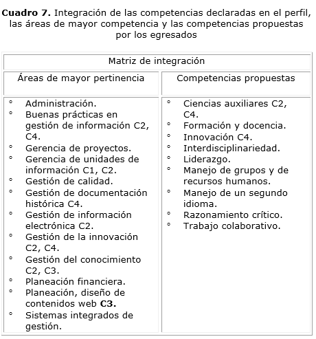 Las competencias anteriormente señaladas se expresan en el perfil profesional, declarado en el diseño curricular del programa. A partir de tales competencias, se hizo un ejercicio de cotejo con la información aportada por los egresados. Dicho cotejo permitió corroborar que, en efecto, muchas de las competencias declaradas en el perfil profesional fueron identificadas por los egresados, en función de asumirlas como áreas de mayor pertinencia. Para mostrar la integración entre estas competencias y las áreas consideradas de mayor pertinencia por parte de los egresados, se diseñó una matriz en la que se aprecian todos los datos (cuadro 7).
