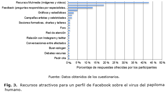 Para saber el tipo de recursos a utilizar para que el perfil resulte atractivo según la opinión de los jóvenes, se les pidió a los participantes que nombraran tres recursos que les parecieran más adecuados y explicaran las razones. Los recursos más nombrados fueron: multimedia (43 %; n= 65) como imágenes y videos, ya que lo consideran una forma directa de comunicar sobre la enfermedad, entretenida y que ayuda a comprender mejor el tema; los testimonios reales (19 %; n= 29), más atractivos que la información impersonal y porque ayudan a concientizar; y la interacción mediante feedback (13 %; n= 20) con la realización de preguntas que sean contestadas por especialistas, y ofrezcan un trato más cercano y personal. En menos medida sugirieron el uso de enlaces a artículos de fuentes fiables para poder profundizar en el conocimiento sobre el VPH (5 %; n= 7) y la publicación de gráficos y estadísticas con datos objetivos para conocer la envergadura de la enfermedad (3 %; n= 4). Por último, con menos de un 2 % de presencia, se sugirió la utilización de artistas, celebridades o personajes públicos influyentes que aporten credibilidad a la información, visibilidad a la enfermedad y que ejerzan de referentes en la formación de opinión pública (Fig. 3).