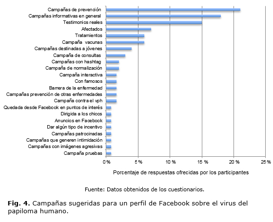 Por otro lado, los jóvenes son grandes usuarios de las redes sociales. A nivel mundial hay cerca de 2,8 billones de usuarios de redes sociales; el 37 % de la población mundial.10 Entre las redes más populares encontramos Facebook, con 2 billones de usuarios activos al mes, de los cuales el 47 % corresponde a jóvenes y adolescentes (16-34 años).11 Estas comunidades virtuales proporcionan información e interconectan a personas con afinidades comunes. Los jóvenes pueden crear un perfil, agregar contactos e interactuar con ellos, compartir información y colaborar en la generación de contenidos. Esto permite la identificación, la creación de identidad y el establecimiento de normas sociales mediante, por ejemplo, la publicación de fotos y comentarios de otros.12-14 Además, estas plataformas basadas en la conexión y en los vínculos con otros permiten el cambio de actitudes y de comportamientos a escala masiva, y facilitan que la difusión de la información llegue a millones de personas.15 Por lo tanto, podemos decir que las redes sociales se presentan como espacios que ofrecen a los especialistas de la salud la oportunidad de crear intervenciones sobre educación sexual, que lleguen a los jóvenes, que les atraigan y ayuden al conocimiento de enfermedades, y que permitan romper esas barreras mencionadas anteriormente ante enfermedades de transmisión sexual como el VPH.16