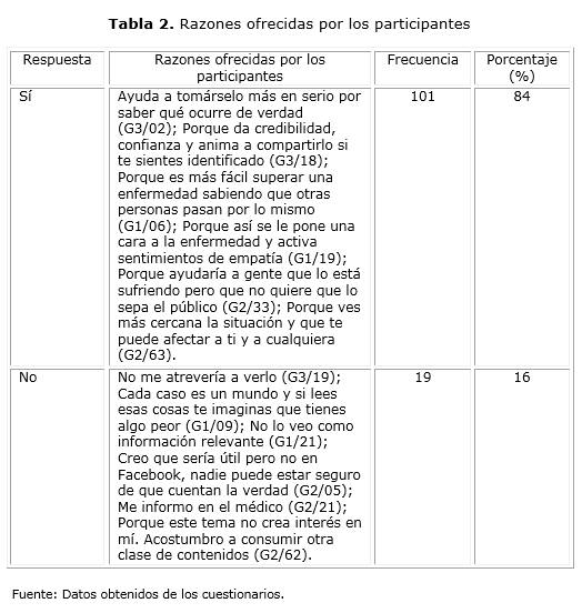 Varias investigaciones han validado el papel motivador de los testimonios reales en los cambios de conducta.20-23 Para comprobar si los jóvenes estarían cómodos viendo testimonios reales sobre afectados por el VPH en Facebook se les preguntó si los consideraban útiles. La mayoría de los participantes (84 %; n= 101) contestaron afirmativamente. Según los jóvenes ayudan a concientizar, a normalizar la enfermedad y despiertan empatía y confianza (tabla 2).