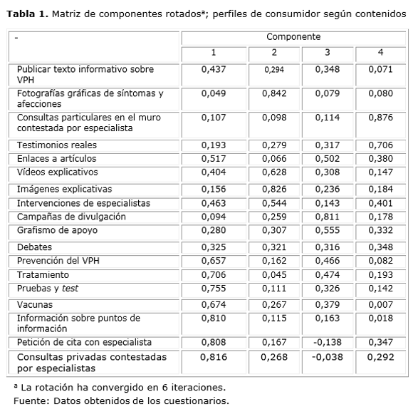 Los datos indican que los cuatro componentes explican un alto porcentaje de la varianza total (69,013 %). El factor 1 es el que más porcentaje de la varianza explica, (27,958 %). Por lo tanto, podemos distinguir cuatro perfiles de consumidores: uno voyeur interesado en información variada y el anonimato; uno más escéptico que prefiere la opinión de especialistas; otro divulgativo que ayuda a la difusión de cartelería y campañas; y otro más empático que prefiere los testimonios y los casos reales. Se empleó el método de rotación (tabla 1).
