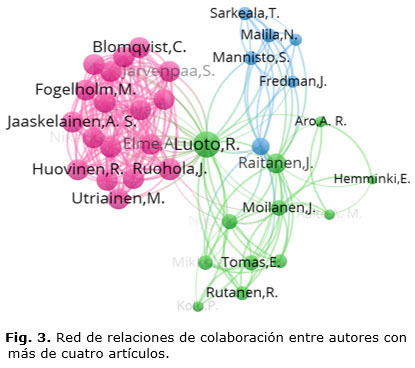 Al analizar la red social, se observa una densidad de cohesión de 0,3778 y una desviación estándar de 0,48; de modo que presenta el 37,78 % de las posibilidades de cohesión. El total de vinculaciones internacionales de los autores con más de cuatro trabajos es de 476 con una media de 13,22 ± 6,69 (Fig. 3). El grado de centralidad de entrada es del 61,06 % y el de salida es del 40,50 %. Los autores más próximos al resto fueron R. Luoto, J. Ruohola y A.S. Jaaskelainen, a la vez que R. Luoto, J. Moilanen y J. Raitaenen han presentado un mayor grado de intermediación. Dicho grado es del 48,42 % con una media de 28,55 ± 97,57 y 1,028 vinculaciones. Los cinco autores con más colaboraciones nacionales son: R. Luoto y J. Raitanen, con seis artículos; C.H. Nygard y E. Tomas, con cinco y K. Mansikkamaki, con cuatro.