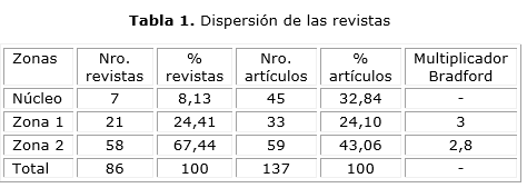 Los 137 artículos se han publicado en 86 revistas de ámbito internacional, de las cuales el 58,14 % de estas presentan factor de impacto en el Journal Citations Reports de la Web of Science. La producción está publicada en inglés, excepto un artículo que se encuentra en portugués. Tras aplicar la fórmula d'Egghe se obtiene una k de 3,02 y una distribución de tres zonas con un núcleo (r0) de 7 revistas (tabla 1).