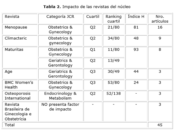 Las revistas del núcleo se muestran en la tabla 2, donde se indica su impacto. Se destacan la revista Maturitas, por su mejor posición en la categoría OBSTETRICS & GYNECOLOGY, y Menopause, por ser la que presenta un mayor volumen de artículos.