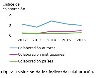 Las coautorías representan el 97,10 % de la producción; la colaboración institucional el 46,10 % y por países el 11,27 %. El índice de colaboración de los autores ha sido de 5,68 ± 4,31; entre instituciones de 1,75 ± 0,62 y entre países de 1,14 ± 0,17. La evolución de los índices de colaboración anual queda reflejada en la figura 2.