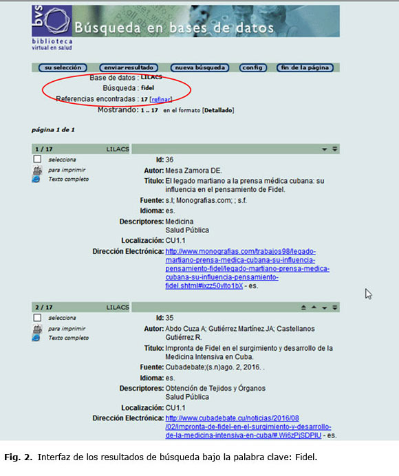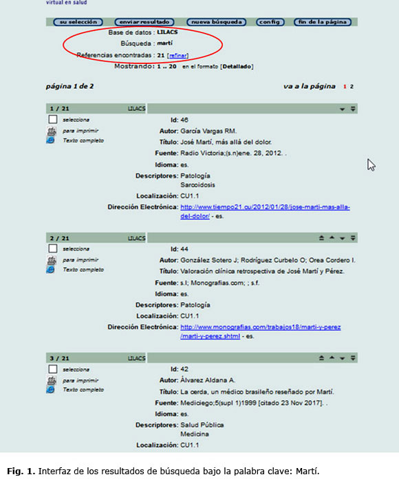 La BD es atendida por una especialista de las Ciencias de la Información del Área de Servicios al Público de la BMN, quien realiza una minuciosa estrategia de búsqueda en diferentes fuentes nacionales e internacionales sobre la temática objetivo de la BD y garantiza los registros con un nivel tanto retrospectivo como actual. En la figura 1 se muestra el resultado de búsqueda bajo la palabra clave Martí, y en la figura 2 se sigue igual estrategia, utilizando la palabra clave Fidel.
