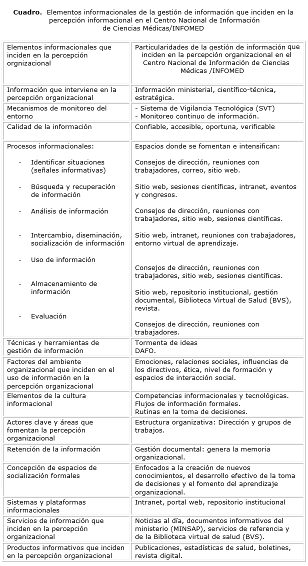 A partir del análisis de las categorías examinadas se identificaron los elementos informacionales de la gestión de información que inciden en la percepción organizacional del CNICM/INFOMED. En el cuadro se presentan aquellos elementos que inciden y juegan un rol fundamental para el desarrollo de la percepción organizacional del Centro. Si bien existen otros componentes y elementos de la gestión de información, los que se muestran constituyen los que repercuten en los procesos particulares de la percepción organizacional.