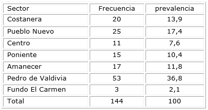 Si incorporamos los mismos datos con su componente geográfico (coordenadas XY en Unidades Transversas de Mercator) en un SIG podemos generar como producto de información una cartografía epidemiológica y observar una tendencia de ataques que podemos describir como una distribución concéntrica en las zonas de Pedro de Valdivia y en la unión entre las zonas de Costanera y Pueblo Nuevo, aleatoria en la zona Poniente, Amanecer y Centro, y que es débil hacia la periferia de la ciudad (Fig. 1). Se ha agregado la red asistencial de atención primaria (cruces amarillas) para fines ilustrativos.