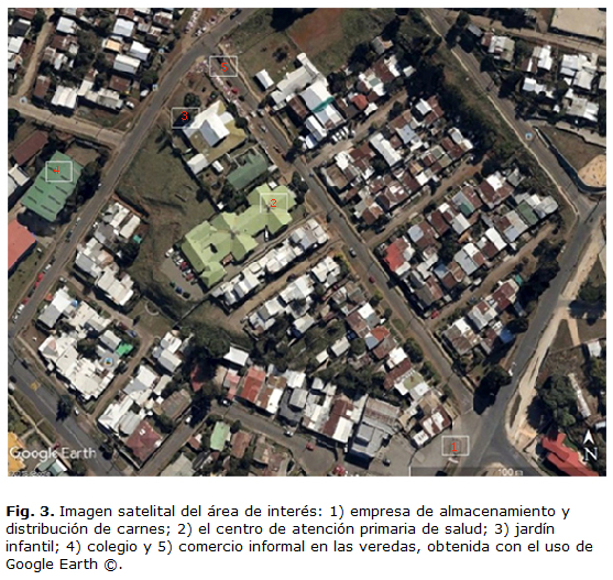 La utilización de herramientas tecnológicas complementarias, como Google Earth ©, nos permite obtener imágenes satelitales gratuitas en las que podemos identificar y evaluar los eventos de interés con referencia a las fuentes fijas de información como: casas, construcciones, áreas verdes, vertederos y otros (que no cambian en años) y reducir los costos en recursos humanos y logísticos. Se debe tener en consideración que existen diferencias en las mediciones de distancia o longitud entre objetos. Mientras más estrechas o detalladas sean las mediciones sobre un área geográfica (centímetros o pocos metros) mayor podría ser el error de las mediciones.23 Así también, las coordenadas reales de un objeto de interés versus las reportadas por la plataforma suelen estar desplazadas varios metros. Por último, una evaluación presencial experta en terreno siempre tendrá mejores resultados (Fig. 3).