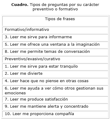 Para dar respuesta al objetivo principal de este estudio, mediante una encuesta, valoramos algunos de los aspectos que se consideraron tradicionalmente asociados a la lectura, tales como valores de tipo formativo e informativo y otros de tipo de frases con valores más cercanos a los beneficios que la lectura produce sobre la salud, tanto en aspectos preventivos como curativos. La cuestión era determinar qué valores prevalecían en sus respuestas.