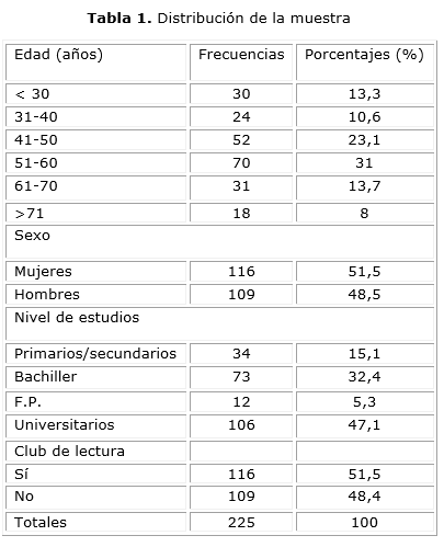 La mayor parte de la muestra tenía estudios universitarios (47,1 %); el 32,4 % estudios de bachillerato; el 15,1 % estudios primarios o secundarios y el 5,3 % formación profesional. Prácticamente la mitad de la muestra pertenecía a un club de lectura (51,5 %) frente al 48,4 % que no lo integraba (tabla 1).