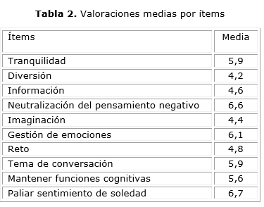 En la tabla 2 se puede observar la media de las puntuaciones asignadas por los lectores a cada elemento. Así se observa que lo que más valoran los encuestados sobre la lectura es su capacidad para acompañarles, o proporcionarles "compañía" (6,7), seguido de su valor para evitar pensamientos negativos (6,6) y gestionar sus emociones positivas o negativas (6,1).