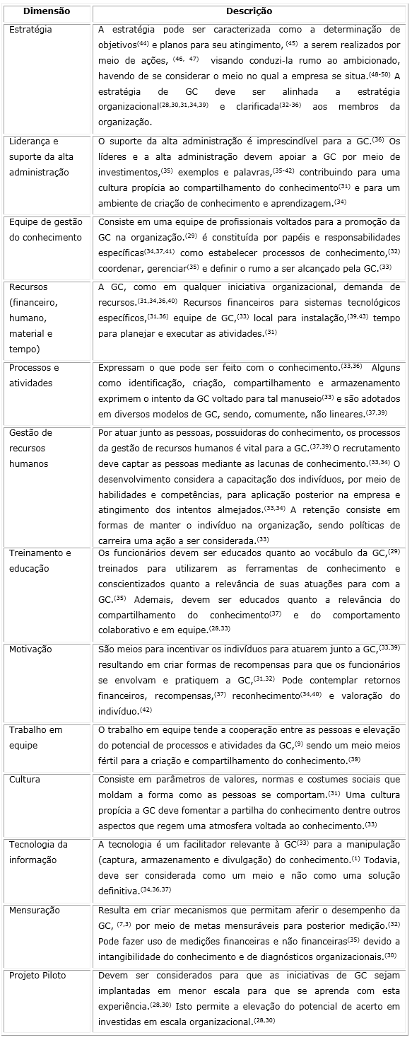Assim, o modelo de Rojas, Bermúdez e Morales(11) contempla as dimensões "Estratégia", "Gestão de recursos humanos", "Cultura" e "Tecnologia da informação", o remetendo ao percentual de 30,8 % (4 do total de 13 dimensões) de adesão ao que considera por GC holística, conforme caracterização apresentada nessa pesquisa.