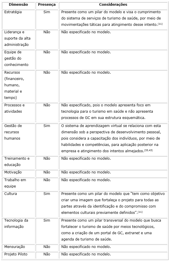 A motivação para a escolha deste modelo é pautada na área de abordagem do modelo e meio científico de divulgação. Primeiramente, o modelo de Rojas, Bermúdez e Morales(11) é orientado a área de saúde, incentivando sua análise para identificar se é uma proposta holística de GC nesta área. Em segunda instância, o modelo foi divulgado na sétima Conferência Internacional sobre Gestão do Conhecimento nas Organizações, sendo esta uma conferência que objetiva "relatar os mais recentes avanços científicos e técnicos na gestão do conhecimento nas organizações".(13) Assim, acredita-se que este modelo possa apresentar um avanço científico, por meio da envergadura holística para a GC no campo da saúde, o que incita sua análise. Registra-se que o resultado desta análise não tem por intento creditar mérito ou demérito ao modelo. Em verdade, busca-se identificar se o referido modelo supriu a lacuna de um modelo holístico para a GC, especificamente para a área de saúde.