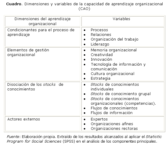 El modelo propuesto es un intento de explicar y de integrar cuatro dimensiones (condicionantes del proceso de aprendizaje, disociación de los stocks, elementos de gestión y actores externos) con un grupo de variablese (cuadro), que facilitan la capacidad de aprendizaje y la interacción entre los distintos niveles de la organización, de forma que, de manera eficiente, tengan lugar la conformación de las relaciones entre los stocks y los flujos de información y conocimiento, con el apoyo de determinados elementos de gestión, a partir de los equipos de proyectos del Sistema de Ciencia e Innovación Tecnológica (SCeIT)53 y que todo tribute a un cambio positivo en el desempeño de la organización.