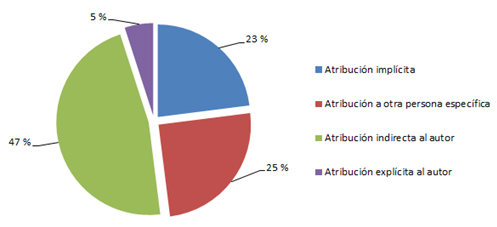 En la muestra pude delimitar 1 430 enunciados. El 25 % de ellos contenían procedimientos explícitos de atribución intelectual ajena (personas específicas diferentes del autor), evidentes por las referencias bibliográficas acotadas y por locuciones introductoras de segundos discursos. En el restante 75 % de los enunciados, la atribución intelectual se comportó como sigue: 5 % de enunciados con atribución intelectual explícita al autor del texto, identificable de manera inequívoca por el uso referencial de la primera persona gramatical, 47 % de enunciados con procedimientos atenuadores de la presencia autoral (indirectos) que podrían remitir al autor del artículo y 23 % de enunciados donde la atribución queda implícita. La figura 1 ilustra esta distribución.