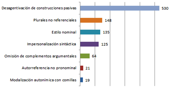 - Desagentivación de construcciones pasivas: construcciones pasivas reflejas o perifrásticas sin agente, así como construcciones con participios de verbos transitivos utilizados sin complemento agente (ej. se planteó que...; los datos analizados...).