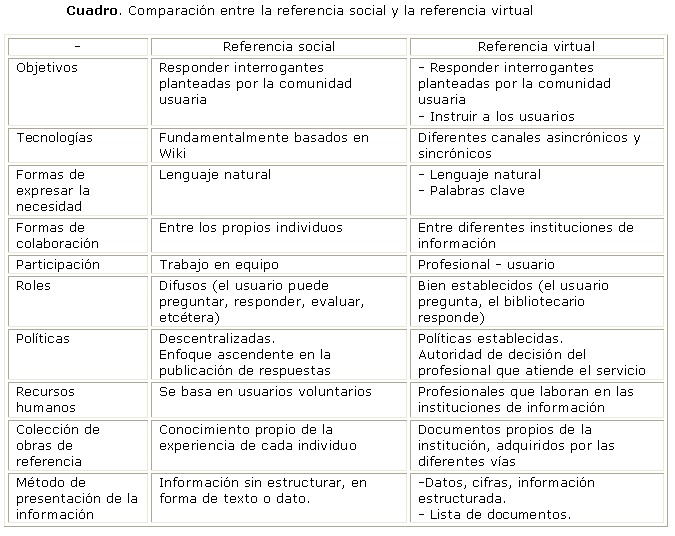 Como se aprecia, la diferencia fundamental entre referencia social y las otras formas de ofrecer los servicios de referencia (tradicional o virtual), reside fundamentalmente en la participación activa y abierta de la comunidad usuaria, en torno a la resolución de las demandas informativas.