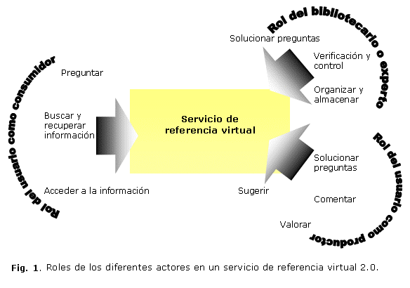Como se observa, en un escenario donde el usuario es protagonista activo y no pasivo de toda oferta de información que la biblioteca desarrolle, el servicio de referencia virtual, a diferencia de modelos anteriores, ha de considerar un nuevo rol para este usuario: el de creador y generador de contenidos, actividad que compartirá con los expertos y profesionales de la información que tradicionalmente han ofrecido el servicio (fig. 1).