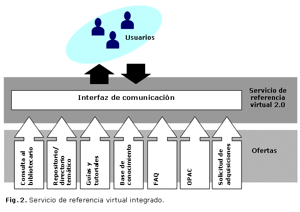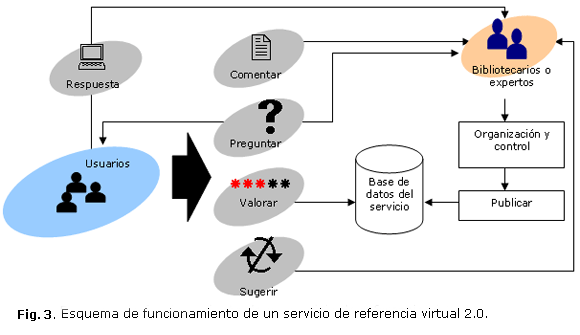 Ahora esta doble función del usuario, como consumidor y productor de contenidos se manifestará en un servicio de referencia virtual a través de las posibilidades de colaborar con los bibliotecarios o expertos en la resolución de preguntas o necesidades de información de otros usuarios, la sugerencia de recursos de información, el comentario a los contenidos disponibles en la oferta y la valoración de los recursos mediante sistemas de puntuación. Estas funciones las desarrollará a la par que las tradicionales de preguntar, buscar, recuperar y acceder a la información que este sistema le proveerá, todo en un ambiente personalizado e integrado.