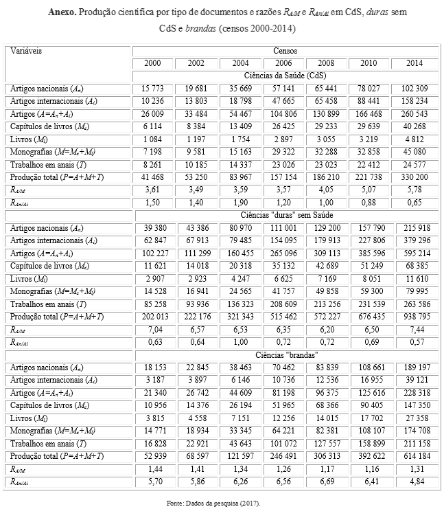 Nos censos 2000-2006 a razão RA/M nas CdS apresenta um valor muito próximo a 3,60, ou seja, produziam ~3,50 artigos para cada livro ou capítulo, valor intermediário entre os das ciências "duras sem CdS" (média 6,6) e das "brandas" (média 1,4). A partir daí, passa a crescer, atingindo 5,78 em 2014, já bem próximo ao padrão das "duras"; i.e., a partir do censo de 2006, as CdS começam a mudar seu perfil de publicação, incrementando a produção de artigos mais significativamente do que a de monografias. Observe-se que a produção de artigos nas CdS cresceu de 104 806 no censo de 2006 para 260 543 no censo de 2014 (~249 %), enquanto a de monografias incrementou-se de 29 322 para 45 080 (~53 %) no mesmo período.