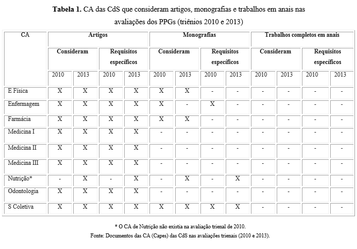 A tabela 1 permite apreciar que, enquanto 100 % das CA consideraram os artigos nas avaliações dos PPGs em 2010 e 2013, com as monografias ou os trabalhos em anais de eventos a situação é diferente. Unicamente Educação Física, Farmácia e Saúde Coletiva (33 %) consideraram as monografias em 2010 e 2013; Enfermagem deixou de considerar as monografias em 2013; Nutrição foi criada só nessa avaliação. Deles, apenas Educação Física e Farmácia não estabeleceram requisitos para sua avaliação; Nutrição e Saúde Coletiva aceitam somente publicações de carácter científico; outros tipos de publicações (técnicas, divulgação, didáticas) não são consideradas. O resto das CA (67 %) considera as monografias como produção técnica ou outro tipo de produção e, portanto, não pontuam nas avaliações. A contraste se incrementa com os trabalhos em anais; nenhuma CA considera esse tipo de publicação.