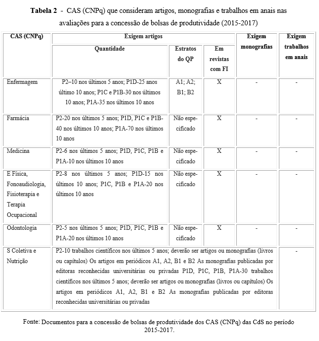 Como acontece em outras grandes áreas, cada CA e CAS das CdS avalia essas dimensões de forma independente, atribuindo a cada uma um peso específico que varia (0 -100 %); porém, a produção científica é o elemento mais valorizado, alcançando 35-40 % nas CA e 50 -70 % nos CAS. A avaliação dessa última é realizada por meio de um grupo de ferramentas conhecidas como "família Qualis": Qualis Periódicos (QP) para a publicação de artigos; Qualis livros (RCL) para as monografias (livros, capítulos); Qualis Artístico (QA) para a produção artística (música, artes visuais, etc.)25,26,27 e até 2009, Qualis Eventos (QE) para os trabalhos apresentados em uma seleção de congressos, workshops, etc.(27) Porém, tanto no caso da Capes, quanto do CNPq, manifesta-se o uso predominante da QP como ferramenta de avaliação.